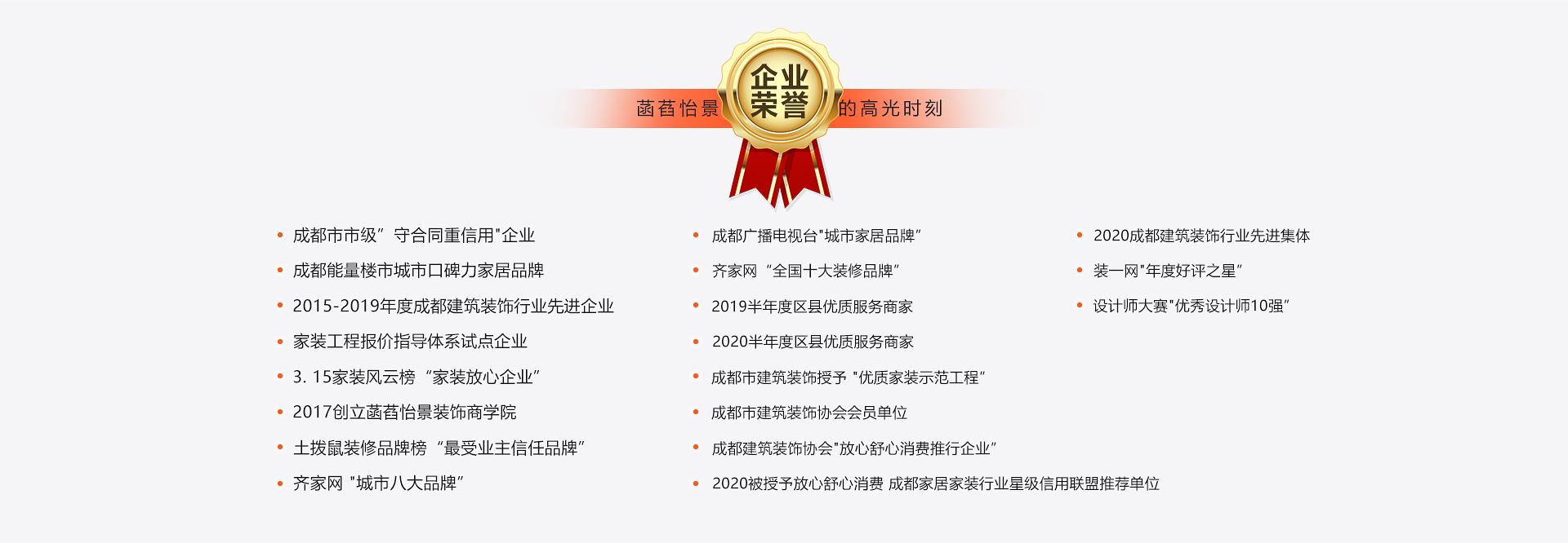 自2009年成立以來,菡萏怡景深耕裝飾裝修行業16年,一路成長,一路收獲,先后榮膺2013中國家居總評榜中國家裝整裝領導品牌、2014榜樣中國·傳媒大獎魯班金獎、2018年誠信典范十佳單位、2021年成都放心舒心消費服務試點企業等20項榮譽。