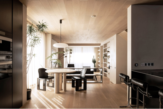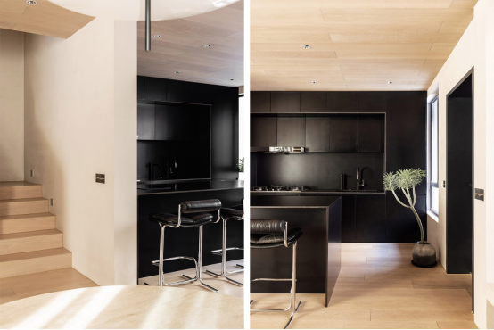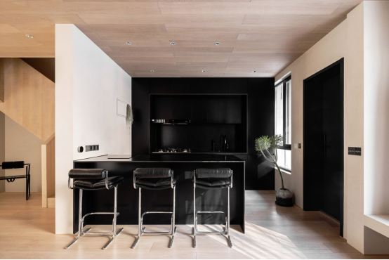 去掉天井之后的一層,主要被劃分成兩大活動(dòng)區(qū)域,右側(cè)是以會(huì)客為主的客廳兼帶客衛(wèi),左側(cè)則是開放式餐廚空間。空間的劃分變得更加明確,不僅是采光得到了極大的提升,空間感也更強(qiáng)。米色調(diào)墻面結(jié)合木色、黑色、不銹鋼色貫穿全案,讓整個(gè)設(shè)計(jì)擁有了整體性,但這些色彩又以不同的比例在各個(gè)空間中呈現(xiàn),使得所到之處都充滿驚喜