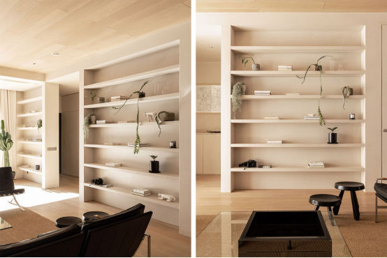 從玄關(guān)進(jìn)入客廳,首先能看見(jiàn)兩面相互對(duì)稱的內(nèi)嵌式書墻,這里用來(lái)陳列書籍、植物和男主人收藏的擺件。為了防止變形,隔板內(nèi)使用了方鋼,十分穩(wěn)固。內(nèi)嵌的燈帶,也可以在夜晚提供照明,讓周圍充滿氛圍感。書墻表面依舊刷了米色涂料,讓它與墻面材質(zhì)色彩一致,也和周圍的木色十分搭調(diào)。書架的高度和左側(cè)的梁、右側(cè)的門洞同高,也是為了更有整體性。