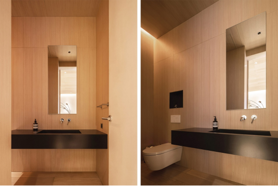 一層客衛(wèi)因?yàn)橹还┛蛷d使用,所以沒(méi)有設(shè)計(jì)淋浴區(qū)。無(wú)淋浴區(qū)的衛(wèi)生間大膽使用了木飾面,和客廳質(zhì)感統(tǒng)一的同時(shí),顯得更溫馨。黑色巖板洗手池頗具質(zhì)感,金屬色的鏡邊和水龍頭相呼應(yīng),細(xì)長(zhǎng)的鏡子讓層高看起來(lái)更高。