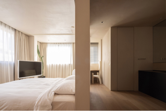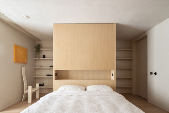 主臥的格局就比較有趣,臥室、三分離衛(wèi)生間、雙開門衣帽間分別形成了中軸對(duì)稱,很有秩序感。床在臥室的中心,因?yàn)楸趁嬖O(shè)計(jì)了通頂?shù)谋嘲澹哉w形成了一個(gè)“洄游動(dòng)線”。從外面進(jìn)入室內(nèi),背板的遮擋,讓生活擁有一定的私密性。床頭兼具收納功能,在條狀壁龕的側(cè)壁設(shè)置了插座和開關(guān),方便屋主隨手充電和放東西。