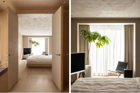 床榻的左手邊有一扇雙開的隱形門,門的表面刷了和墻面一致的色漆,更有整體性。而推開兩扇非常有儀式感的門之后,會(huì)進(jìn)入木盒子一樣的空間。原來(lái)的天井被填平之后,空間被納入主臥,所以這里就成為了男主人的衣帽間。L型的落地衣柜隱去了把手,和地面、天花板融為一體。旁邊的矮柜可以用來(lái)放領(lǐng)帶、手表、首飾等小物件。大面積淺木色不會(huì)顯得空間壓抑,給人無(wú)限溫柔的感受。